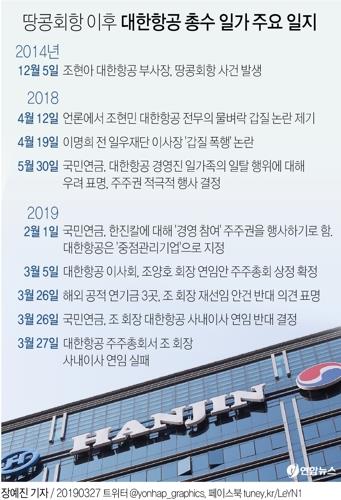 (서울=연합뉴스) 김동규 기자 = 조양호(70) 한진그룹 회장의 대한항공[003490] 사내이사직 박탈은 지난해 차녀 조현민 전 대한항공 전무의 이른바 '물컵 갑질'이 도화선이 됐다.
