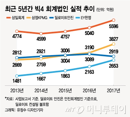 '빅4'는 매출액 기준 1위 삼일회계법인을 필두로 삼정KPMG, 딜로이트안진, EY한영의 순이다. 이들 '빅4'는 크게 △회계감사 △세무자문 △재무자문 △컨설팅 등 사업조직을 갖추고 각 시장에서 치열한 경쟁을 벌이고 있다. 이름을 대면 알 만한 국내 대기업의 회계감사는 사실상 '빅4'의 몫이다. 회계발 시장개혁을 이들이 주도하고 있다고 해도 과언이 아니다.