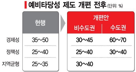[아시아경제 임철영 기자] 20년 만에 바뀐 예비타당성조사(예타) 제도는 예상대로 '균형발전'에 방점이 찍혔다. '주민의 삶의 질'에 기여하는 사회적 가치 평가를 한층 강화함에 따라 그동안 답보 상태를 보였던 수도권 교통 인프라 사업과 동해안고속도로, 부산 경부선 철도 지하화 등 지역 숙원 사업이 탄력을 받게 됐다.
