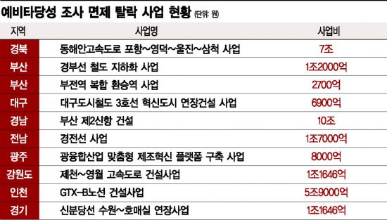 부산 경부선 철도 지하화와 부전역 복합 환승역 사업, 대구 도시철도 3호선 혁신도시 연장 건설, 광주 광통신산업 맞춤형 제조혁신 풀랫폼 구축 등 지방 광역시 SOC 사업도 지난 1월 예타 면제를 받지 못했으나 제도 개선에 따라 속도를 낼 수 있을 것으로 보인다. 비수도권 평가 시 '지역 낙후도'를 감점 항목에서 삭제키로 했기 때문이다. 이 밖에 전남 경전선 복선 전철화, 강원 제천~영월 고속도로, 경남 제2신항 건설 등도 사업 추진에 탄력이 붙을 것이란 기대감이 나온다.
