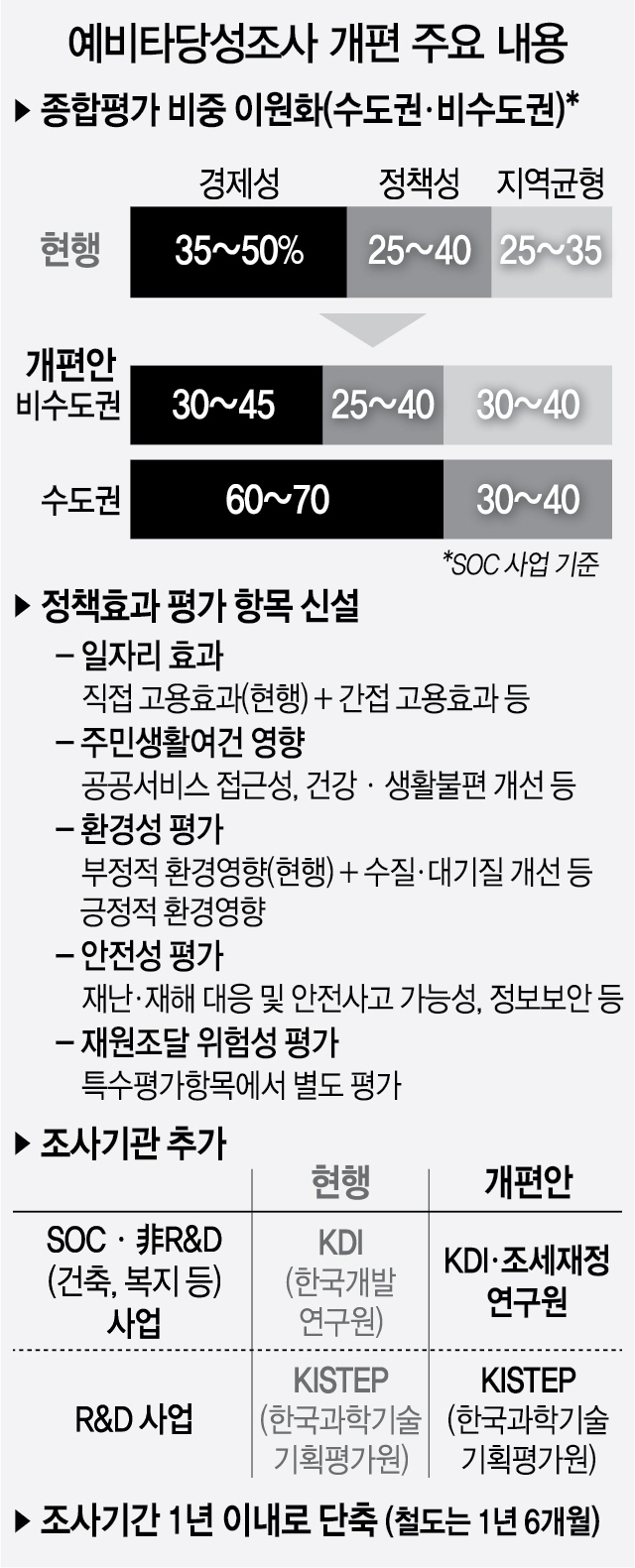 반면 비수도권은 경제성 비중을 30~45%로, 5%포인트 낮추면서 지역균형 비중은 30~40%로 높였다. 이승철 기획재정부 재정관리관은 “비수도권 사업의 균형발전 요인을 높게 평가하겠다는 점에서 예타 통과율이 현재의 65%보다는 높아질 것”이라고 설명했다.
