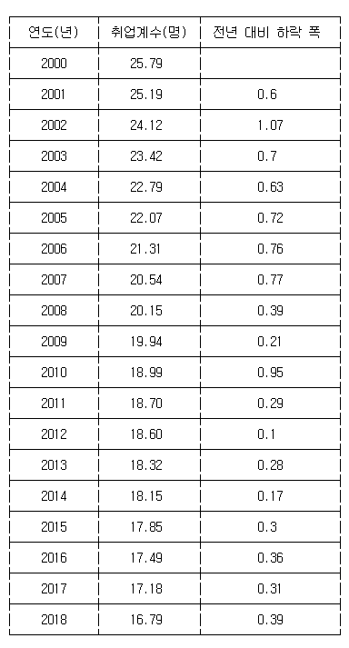 1990년 43.1명이었던 취업계수는 7년 만인 1997년 29.6명으로 30명대가 붕괴됐다. 이어 2009년 19.9명을 기록한 뒤 20명대를 회복하지 못하고 있다.