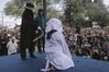 지난해 4월20일 인도네시아 반다 아체의 이슬람사원(모스크)에서 샤리아법 집행관이 얼굴을 가린 채 꿇어 앉는 여성 무슬림에게 채찍 태형을 가하고 있다. 이 여성은 성매매 혐의로 구속 수감돼 왔다. 이날 또다른 남녀 커플은 공공장소에서 애정 행각을 했다는 이유로 마찬가지로 공개 태형을 당했다. [AP=연합뉴스]