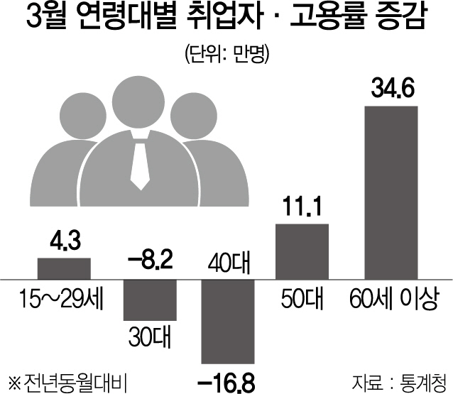 산업별로 보면 정부 재정이 떠받치는 보건·사회복지서비스업(17만2,000명)과 공공행정·국방·사회보장행정(7,000명)에서만 전체 취업자의 68%가 늘었다. 정부가 올해 각각 전년 대비 10만개씩 늘린 노인 일자리 사업(총 61만개)과 사회서비스 일자리(15만1,000개)의 대부분이 이들 산업에 속한다. 60대 이상 어르신과 무급가족종사자가 대부분인 농림어업도 7만9,000명 늘어 역대 최대 수준의 증가세를 이어갔다. 반면 제조업 취업자는 10만8,000명 줄어 지난해 4월 이후 12개월 연속 감소했고, 금융·보험업, 도소매업 등도 줄었다. 연령별로는 60세 이상은 취업자가 34만6,000명 늘어 지난 2월(39만9,000명)에 이어 역대 두 번째로 큰 증가폭을 기록한 반면 30·40대는 또 다시 취업자가 감소했다. 인구 감소를 고려한 고용률도 30대는 보합에 머물렀고 40대는 0.6%포인트 떨어져 13개월 연속 하락했다. 글로벌 금융위기 당시(2008년 12월~2010년 2월) 이후 가장 긴 내리막이다.