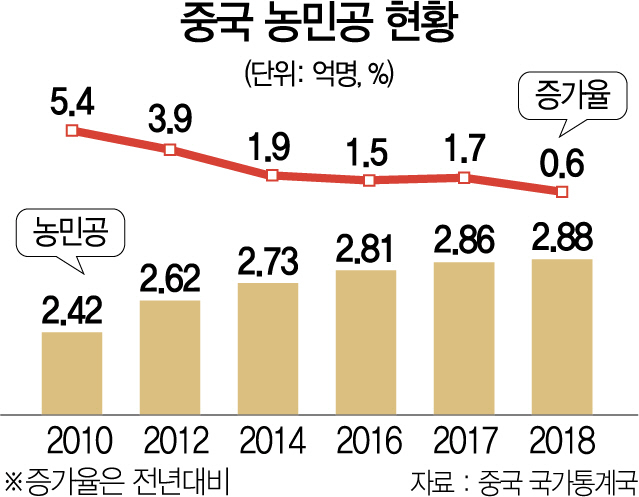 농민공 숫자도 줄지 않고 있다. 당초 2016년부터 시작된 제13차 5개년계획에 따르면 오는 2020년까지 1억명의 농민이 도시민으로 전환될 예정이었다. 하지만 중국 당국의 통계만 봐도 2014년 2억7,395만명이던 농민공은 지난해 2억8,836만명으로 오히려 더 늘었다. 현재 진행되고 있는 신형도시화가 농민들을 제대로 흡수하지 못하고 있다는 반증이기도 하다. 친후이 전 칭화대 교수는 “후커우제도는 여전히 인권이나 재산권·공공서비스 등에서 불평등을 만들고, 특히 가난한 농민공들을 화나게 하고 있다”고 말했다.