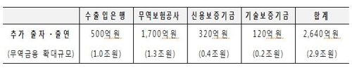 신용보증기금에 320억원, 기술보증기금에 120억원을 투입할 계획이다. 각각 4천억원과 2천억원 규모로 무역 금융이 확대될 것으로 정부는 기대했다.