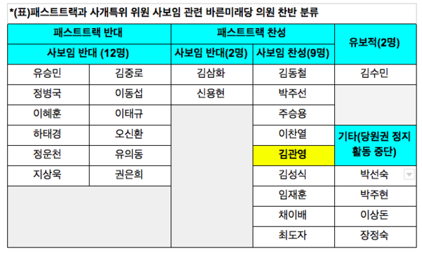 권·오 의원에 대한 강제 사보임 반대에 서명한 의원은 이날 참석한 9명의 의원에 정운천·김삼화· 김중로·신용현 의원까지 총 13명이다. 유승민 의원은 "제가 김 원내대표와 통화하면서 국회 대치 상황이 상당히 심각하다, 이것을 오래 끄는 것은 좋지 않다"며 "고민은 하되, 최대한 빨리 (결단을) 해줬으면 좋겠다"고 했다.