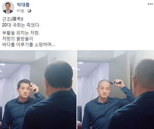 박 의원은 30일 패스스트랙 지정에 반발하며 오후 1시쯤 사회관계망서비스(SNS)에 삭발 인증 사진을 게시했다.