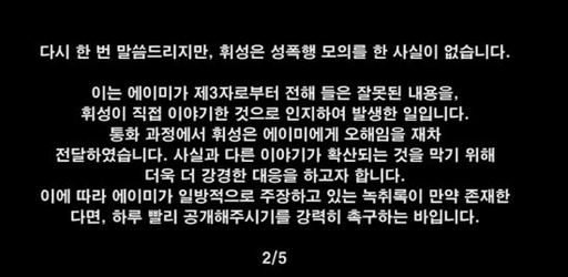 음성 파일에서 지인은 휘성에게 성폭행 모의 언급을 한 적 없다고 설명했고, 이 사실을 알게 된 에이미는 휘성에게 사과했다.