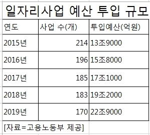 지난해의 경우 정부의 재정지원 일자리사업에 총 19조2000억원의 예산이 투입됐고 831만명이 참여했다. 15~64세의 생산가능인구 3680만명의 22.6%에 해당한다. 하지만 직접일자리 사업 참여자의 64.0%인 56만명이 노인이다. 노인을 위한 ‘단기성 용돈 주기’ 사업이라는 비판이 나오는 이유다. 게다가 3년간 2회이상 반복참여율이 20.8%에 달해 일자리 라기보다 소득보조 역할에 그쳤다.