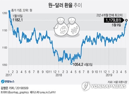 (서울=연합뉴스) 김연숙 기자 = 미국과 중국 간의 무역갈등이 격화하면서 9일 원/달러 환율이 연거푸 연중 최고점을 찍고 1,179원대로 마감했다. 전날보다 10원 넘게 올랐다.