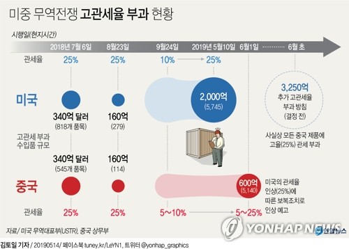![[그래픽] 미중 무역분쟁 일지(서울=연합뉴스) 장예진 기자 = 13일 신화통신에 따르면 중국 정부는 이날 성명을 통해 "미국의 관세 부과에 대응해 6월 1일 오전 0시부터 미국산 수입품 일부에 대해 추가 관세를 부과할 방침으로, 관세율은 품목별로 5%, 10%, 20%, 25%가 될 것"이라고 밝혔다. 보복 관세가 부과되는 품목은 총 5천140개 품목이다. jin34@yna.co.kr](http://static.news.zumst.com/images/3/2019/05/14/GYH2019051300200004400_P2.jpg)