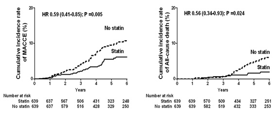 이상학 교수 연구팀은 2005년부터 2016년까지 세브란스병원 심장내과를 방문한 환자 중 내원 전에 심혈관질환이 없었던 6414명을 대상으로 성향점수 보정분석을 통해 스타틴을 정기적으로 복용하고 있는 639명과 스타틴을 복용하지 않는 639명을 두 그룹으로 나눠 5.2년간 추적조사했다.