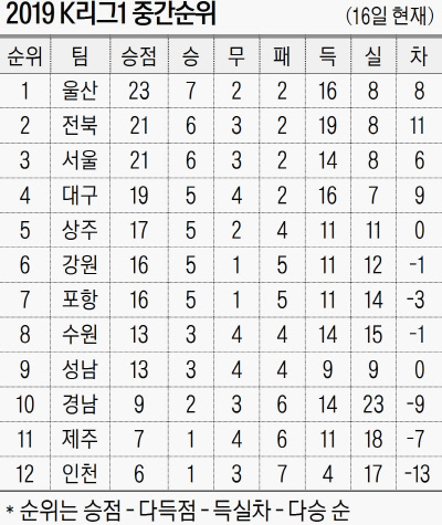 울산은 지난 12일 전북과의 맞대결에서 2-1로 승리하며 전북을 승점 2점 차로 제치고 첫 번째 반환점을 선두로 돌았다. 강력한 수비 속에 김인성·주니오의 공격진과 김보경·믹스의 미드필더 조합 등이 위력을 떨쳤다. 독주가 사라진 상위권 판도는 축구팬들이 리그에 대한 관심을 계속 이어가게 만들고 있다.