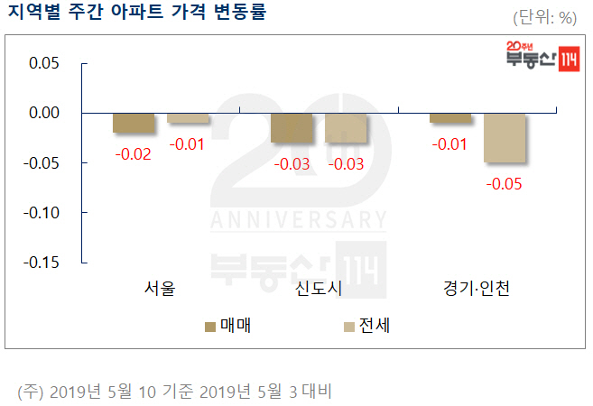 신도시와 경기·인천 지역 아파트 전세가는 각각 0.03%, 0.05% 하락했다.