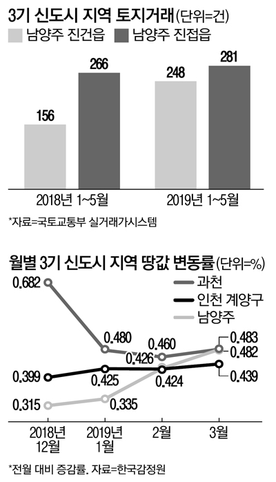한국감정원에 따르면 작년 초만 해도 매달 0.2~0.3% 정도 뛰던 남양주 땅값은 점점 높아지더니 올 2월엔 0.426%, 3월엔 0.482% 상승했다. 인천 계양구 역시 지난해 8월까지는 매달 0.2% 안팎으로 토지가격이 뛰었지만 올해 1월 0.425%, 2월 0.424%, 3월 0.439%씩 가격이 고공 행진하고 있다.