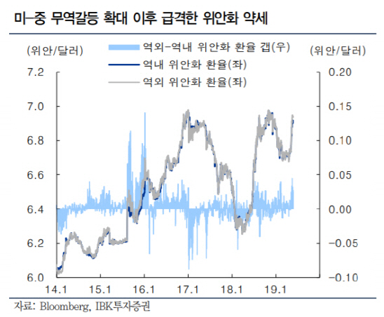 당분간 위안화는 약세를 면치 못하리란 판단이다. 안 연구원은 “역외 위안화 환율이 역내 위안화 환율보다 높은 수준으로 형성되는 등 시장에서는 위안화 숏 베팅이 계속되고 있다”며 “무역분쟁과 그로 인한 중국의 경기 둔화, 자금이탈 우려가 쉽게 진정되긴 어려운 상황”이라고 설명했다.