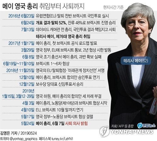 메이 총리는 24일(현지시간) 보수당 평의원 모임인 '1922 위원회' 그레이엄 브래디 의장과 만난 뒤 내놓은 성명에서 오는 6월 7일 당대표를 사퇴하겠다고 밝혔다.