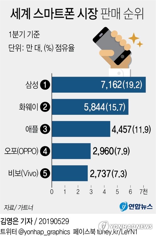 전체 스마트폰 시장의 위축도 계속됐다. 1분기 소비자에게 판매된 스마트폰 물량은 2.7% 감소한 3억7천300만 대에 그쳤다.