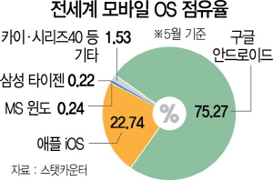 전세계 이동통신기기용 모바일OS시장에서 안드로이드와 iOS의 양강 구도는 좀처럼 깨어지지 않고 있다. 삼성전자(005930)가 독자적인 OS인 ‘타이젠’으로 틈새를 비집고 들어가려 했지만 역부족이었다. 시장조사업체 스탯카운터에 따르면 올해 5월 기준 모바일 OS 점유율은 안드로이드가 75.27%로 1위를 차지하고 있다. iOS는 22.74%로 3분의 1가량 점유율이 낮지만 탄탄한 충성고객층과 개발자들을 확보하고 있다. 도전장을 내밀었던 마이크로소프트(MS)의 윈도는 0.24%, 삼성 타이젠은 0.22%에 불과하다.