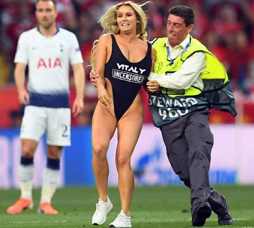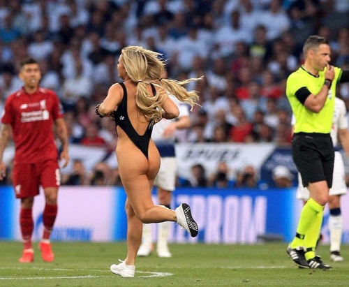 이날 경기는 또 한명의 스타를 탄생(?)시켰다. 리버풀이 1-0으로 앞서고 있던 전반 18분 한 여성이 경기장에 난입해 잠시 경기가 중단됐다. 주인공의 이름은 킨제이 볼란스키라는 모델이었다. 볼란스키는 끈 모노키니만 입은 채 그라운드를 질주했다. 수억명의 시청자들에게 자신의 존재감을 각인시키며 유수의 매체에 소개되는 영광(?)을 안았다.