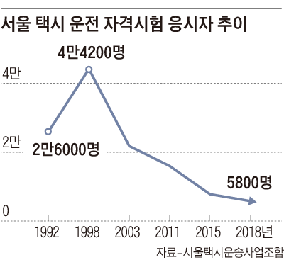 택시 기사는 일자리에서 쫓겨나면 마지막으로 찾는 '최후의 생계 수단'으로 꼽혔지만, 지난해부터 이어진 고용 감소에도 응시자는 크게 줄었다. 1990년대에는 서울 택시시험 응시자가 연간 4만명이 넘을 때도 있었다. 중노동인데 벌이도 시원찮다는 소문이 나면서 2004년부터 1만명대로 급감했고, 2012년에는 1만명 밑으로 떨어졌다. 최근에는 '타다' 등 승차 공유 서비스 업체들까지 등장하면서 '택시 운전해서 돈 벌기 어렵다'는 인식이 더 심해졌다. 작년엔 연간 응시자가 고작 5800명이었다. 불과 7년 만에 응시자 수가 반 토막 났다. "요즘 택시가 어렵다곤 하지만 이거 말고 마땅히 다른 생각이 안 나 일단 면허라도 따두려고 왔다"는 A씨는 "큰 준비도 안 하긴 했지만, 시험이 생각보다 어려워 두 번이나 떨어졌다"고 했다. 이날 192명 중 114명이 합격했다. 합격률이 59%에 그쳤다.