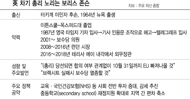더타임스 등 영국 언론들은 “긴 브렉시트 협상에 지친 유권자들이 일단 어떻게든 브렉시트를 빨리 끝내줄 인물을 찾고 있다”고 분석한다. 실제 존슨 전 장관은 유럽연합(EU)과 협상을 하든 못하든 오는 10월 말까지 브렉시트를 끝내겠다고 공언했다.