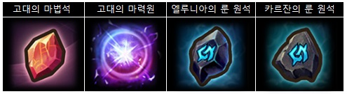 '고대 룬'은 '고대의 마법석'과 '룬 원석'을 필요로 하며, '고대 연성석'은 '고대의 마법석'과 '고대의 마력원'을 재료로 모아 제작 가능하다.
