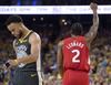 토론토 카와이 레너드(오른쪽)가 14일 미국 오클랜드 오라클 아레나에서 열린 NBA 파이널 6차전에서 우승에 가까워지자 환호하고 있다. 왼쪽은 고개를 떨군 골든스테이트 스테판 커리. 오클랜드=AP 연합뉴스