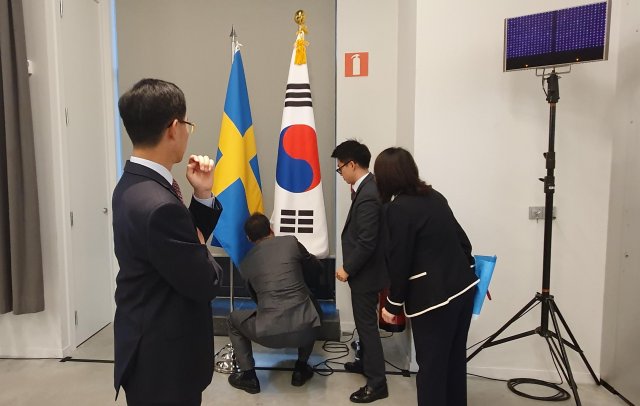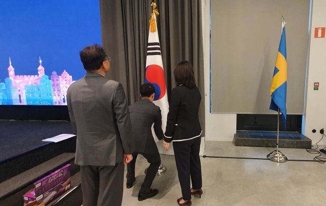 14일 오후(현지시간) 스웨덴 스톡홀름 앳식스호텔에서 열린 한- 스웨덴 비즈니스 서밋에 외교부 직원들이 태극기를 단상에 배치하고 있다. 박영대 기자. sannae@donga.com |