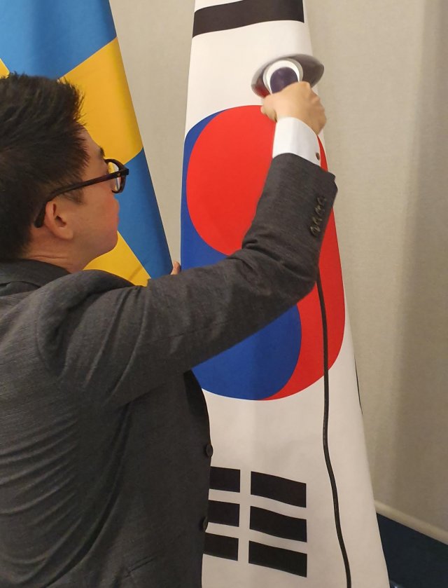 14일 오후(현지시간) 스웨덴 스톡홀름 앳식스호텔에서 열린 한- 스웨덴 비즈니스 서밋에 외교부 직원들이 스팀다리미로 태극기의 주름을 펴고 있다. 박영대 기자. sannae@donga.com |