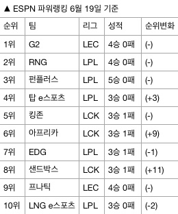 5위를 사수한 킹존에 대해 ESPN은 “스프링 시즌 쌓아온 색깔이 서머 시즌에서 발휘되고 있다”고 평가했다. 지난주보다 각각 9계단, 11계단을 등반한 아프리카, 샌드박스에 대해서는 “더 큰 무대에서 경쟁력을 보여주길 기대한다”고 전했다.