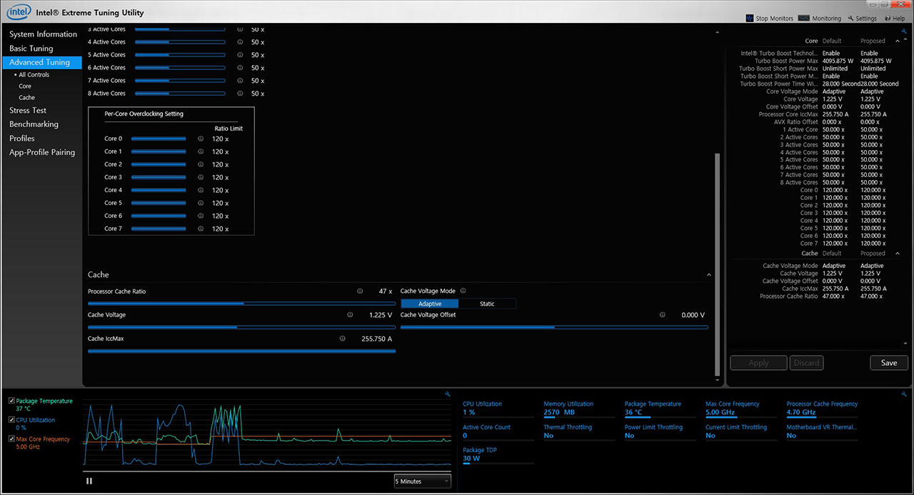 이 같은 시스템 준비가 끝났으면 바이오스나 XTU 등을 통해 프로세서에 공급하는 전략 제한을 해제하고, 프로세서 클럭을 조금씩 높여가며 최대 수치는 얼마인지, 이렇게 높인 상태에서 장시간 사용해도 안정성을 유지할 수 있는지 등을 테스트 하며 최적의 전압과 클럭을 찾아야 한다. 예를 들어 i9-9900K 프로세서의 경우 기본 3.6GHz, 터보시 5GHz 속도로 작동하지만, 시스템의 냉각이나 전력 공급 성능에 따라 5Ghz를 초과해 작동할 수도 있고, 그렇지 못할 수도 있다. 최적의 수치를 찾지 않은 상태에서 지나치게 클럭이나 전압을 높일 경우 시스템이 강제로 정지할 수도 있는 만큼, 초보자는 쉽게 도전하기 어려운 분야이기도 하다.