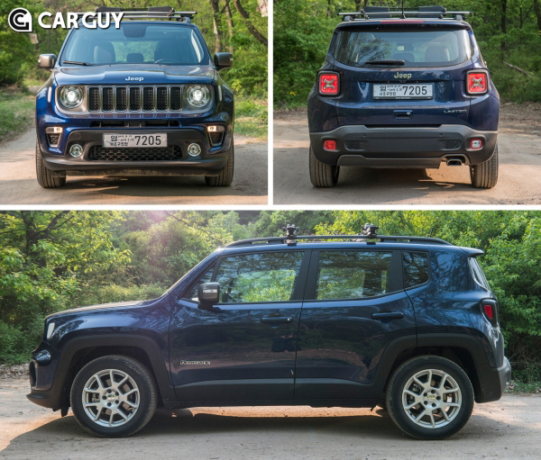 생김새부터 본격적인 오프로드의 기운을 뿜어내는 랭글러와는 다르게 도심형 SUV의 형태에 가까워 부담이 훨씬 적다. 도심에서도, 자연에서도 잘 녹아드는 매력적인 외관이다. 넉넉하게 둘러진 스키드 플레이트와 각진 휠 하우스 덕에 든든함이 느껴지는 동시에 시승차의 네이비 컬러가 세련미를 더한다. 군용지프의 비상용 연료통을 형상화했다는 리어램프는 볼 때마다 아이디어가 돋보인다.