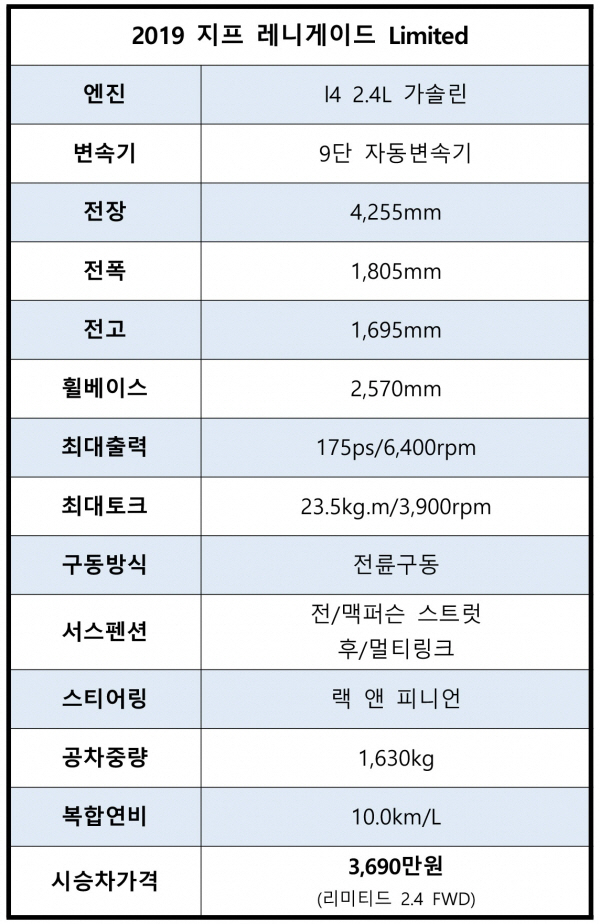 꾸준한 인기로 모델 체인지의 필요성을 느끼지 못해서일까? 출시 후 5년이 지난 지금에야 페이스리프트를 거쳐 돌아온 2019년형 레니게이드를 만났다. 2.4L 자연흡기 가솔린 엔진을 얹은 전륜구동 리미티드 모델이다. 범퍼와 그릴 등 외관 일부를 손봐 세련미를 더했다. 내부 편의사양도 일부 강화해 상품성을 높인 게 특징이다.