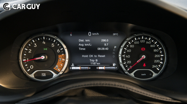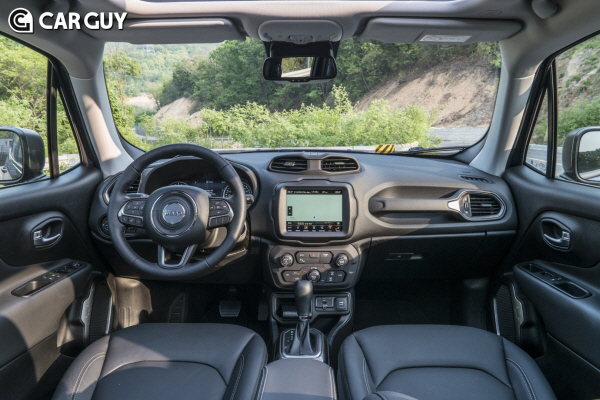 전동접이식 사이드미러를 넣어놓고 도어 잠금 시 함께 접히는 락폴딩 기능은 빠진 게 역시 미국차답다. 시트는 좌우 볼스터가 솟아오른 세미버킷 타입이다. 지지력이 좋고 쿠션도 부드럽다. 조절은 모두 수동식이다. 투박한 모양새의 스티어링 휠은 림이 두꺼워 쥐었을 때 안정감이 느껴진다. 버튼류의 배치도 직관적이라 조작이 편리하다. 계기판은 색감과 조명이 부드러워 장시간 운전해도 눈이 피로하지 않다. 중앙의 7인치 화면을 통해 다양한 정보를 제공하지만 앞서 타 본 랭글러와는 달리 한글화가 되지 않은 점은 아쉬운 부분이다.