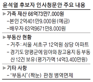 인사청문회에서는 배우자가 60억원대 재산을 형성한 배경과 관련해 집중적으로 검증이 이뤄질 것으로 보인다. 아울러 윤 후보자는 1982년 8월 병역검사에서 질병을 이유로 병역에서 면제됐다. '짝눈'을 의미하는 부동시(不同視) 판정을 받아 전시근로역 처분을 받은 것이다.