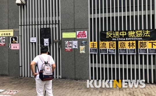 반면, 홍콩 경찰본부는 깨끗했다. 전날 시위의 흔적이라곤 찾아볼 수 없었다. 시위대가 해산하자 경찰은 즉각 정리에 들어간 것이다. 격렬했던 항의의 흔적은, 그러나 신문 1면에 담겼다. 경찰본부 담장은 갈고리 모양의 철 구조물이 빼곡히 세워져 있었고, CCTV는 담장 밖을 비추고 있었다.
