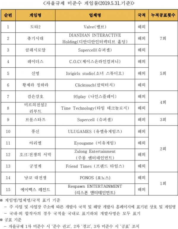 온라인 및 모바일 각 1종의 게임물이 신규 미준수 게임물로 추가됐다. 전월 미준수 게임물 2종의 준수 전환 및 1종이 모니터링 대상에서 제외됐다. 2019년 5월 말까지 자율규제 미준수 게임물은 총 15종이다.