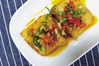 4. 튀긴 가자미위에 소스를 뿌려 완성한다.