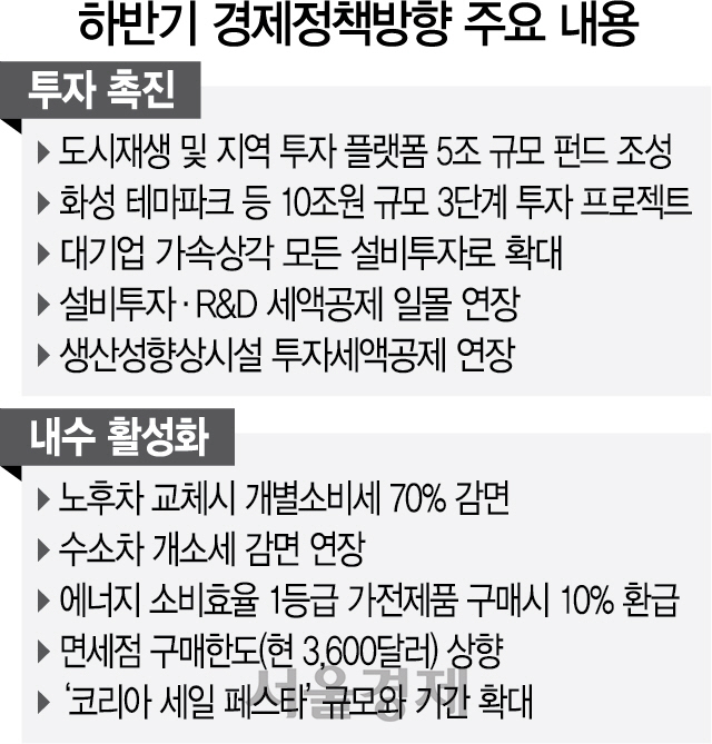 정부가 산업은행 등 정책금융기관의 자금을 마중물로 5조원 규모의 펀드를 조성해 도시재생사업과 관광인프라 등에 투자하는 지역투자 촉진 플랫폼 프로젝트를 추진한다. 또 소비 활성화를 위해 10년 이상 된 모든 노후 차량을 폐차 후 신차를 구입할 때 개별소비세 70% 감면 혜택을 제공하는 등의 ‘개소세 3종 세트’와 전력소비가 적은 에너지 소비효율 1등급 가전제품 구매시 가격의 10%를 환급해주는 방안도 검토하고 있다. 경기 하방리스크가 확대되는 상황에서 투자 및 내수부양책을 통해 경제활력 보강에 중점을 두겠다는 의지로 풀이된다.
