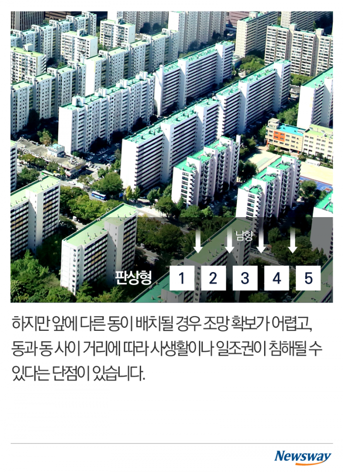 하지만 앞에 다른 동이 배치될 경우 조망 확보가 어렵고, 동과 동 사이 거리에 따라 사생활이나 일조권이 침해될 수 있다는 단점이 있습니다.