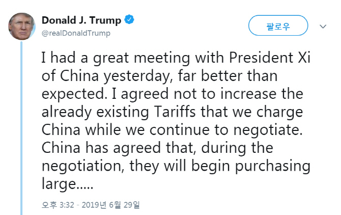 이와 관련, 트럼프 대통령은 “전날 시진핑 중국 국가주석과 예상보다 좋은 만남을 가졌다”면서 “무역협상을 하는 동안에는 기존에 부과된 관세 외엔 추가로 인상하지 않기로 했다. 중국도 동의했다. 그들은 막대한 양의 우리의 위대한 농부들이 생산한 농산물을 사들일 것이다. 우리 IT기업들과 시 주석의 요청에 따라, 우리 국가안보를 위협하지 않는 전제 하에 중국 기업이 그들(미국 IT기업)로부터 제품을 구매할 수 있도록 합의했다”고 강조했다.
