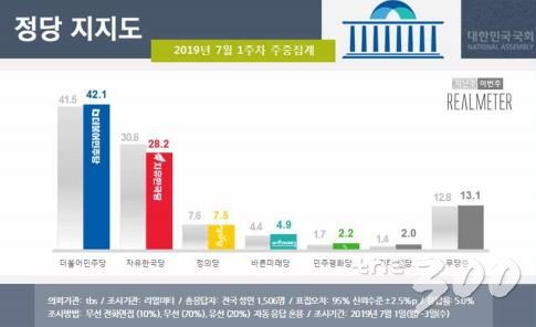 여론조사 전문기관 리얼미터가 tbs 의뢰로 지난 1일부터 3일까지 사흘 동안 전국 19세 이상 유권자 1506명을 대상으로 실시해 4일 발표한 2019년 7월 1주차 주중동향에서 문 대통령의 취임 113주차 국정수행 지지율(긍정평가)은 52.4%를 기록했다. 전주(6월 4주차 주간집계 대비)보다 4.8%포인트 올랐다.