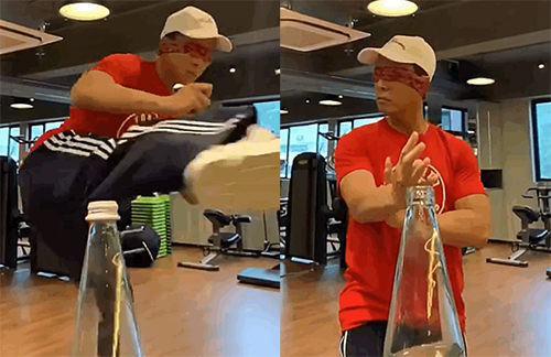 공개된 영상에서 견자단은 모자를 쓰고 손수건으로 눈을 가린 채 발차기로 병뚜껑을 따는 데 성공했다.