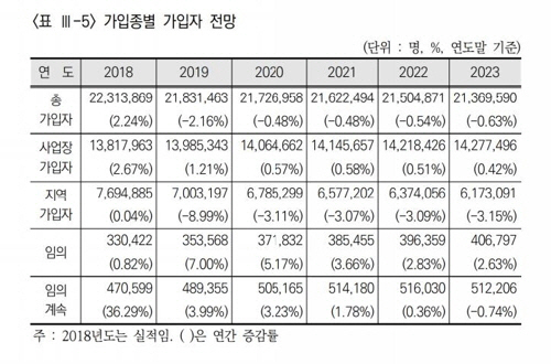 연구팀이 최근 가입자 증감 추이와 생산 활동 인구변화, 인구전망, 경제활동 인구전망 등을 바탕으로 추계한 결과, 전체 가입자는 2018년 말 2,231만명에서 2019년에는 2,183만명 수준으로 감소한다. 이후에도 전체 가입자는 2020년 2,137만명, 2021년 2,162만명, 2022년 2,150만명, 2023년 2,137만명 등으로 감소세를 보일 것으로 예상했다. 1988년 국민연금제도가 도입 후 현재까지 전체 가입자가 일시적으로 감소한 것은 1998년, 2000년, 2004년, 2017년 등 네 차례였다.
