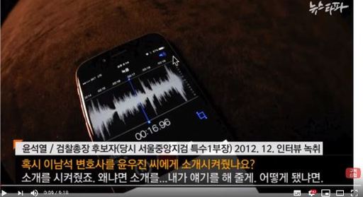 앞서 지난 8일 뉴스타파를 통해 공개된 녹음파일(위 사진) 에서 윤 후보자(당시 서울중앙지검 특수1부장)는 2012년 12월 한 기자와의 전화 통화에서 “대검 중수부 연구관을 지낸 이남석 변호사를 당시 뇌물수수 혐의로 기소된 윤우진 전 용산세무서장에게 소개했다”고 밝혔다. 또한 이 녹취파일에는 윤 후보자와 윤 전 서장이 주말에 골프를 즐기며 상담을 나누는 사이임을 드러내는 내용도 담겨 있다.