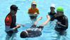 생존수영 강사로 나선 해경은 이날 구명조끼를 입고 수영장에 뛰어든 학생들에게 구명조끼부터 벗겼다. 구명조끼 없이 바다에 뛰어내려야 할 위급 상황에 대비하기 위해서다. 구명조끼 없이 물에 뜨기 위한 첫번째 생존수영법은 주변에서 흔히 찾을 수 있는 물건을 이용한 방법이다. 박 경장은 참가 학생들에게 2ℓ짜리 빈 페트병 2병씩 나눠줬다. 페트병을 아랫배에 놓은 채 귀가 살짝 물에 잠길 정도로 하늘을 바라보고 누우면 물에 떴다.
