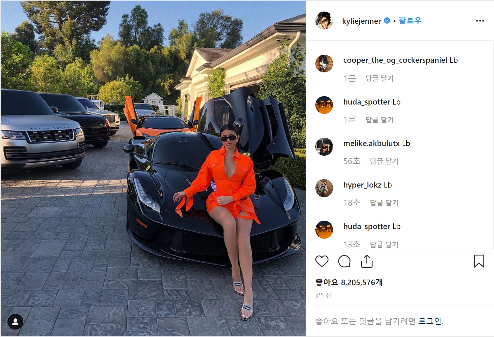 자산 10억 달러(약 1조 1825억 원)를 보유한 세계 최연소 억만장자 카일리 제너(21)가 최근 인스타그램에 자신이 보유한 럭셔리카를 대거 공개했다. 대다수 팬은 부럽다는 반응을 보였지만, “돈을 좀 더 의미있는 곳에 써라”, “환경에 나쁘다” 같은 비판도 쏟아졌다.