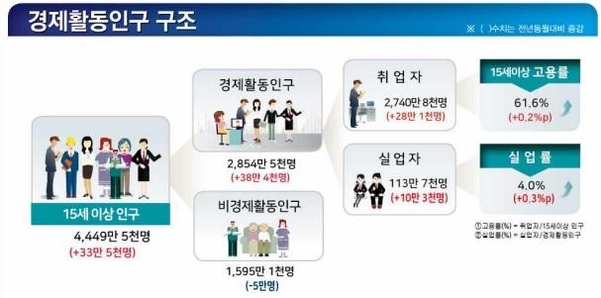 종사자 지위별로는 임금근로자 중 상용직이 38만8000명 증가했고, 임시 근로자는 8만5000명 감소했다. 비임금 근로자는 2만8000명 감소했는데, 이 중 고용원 있는 자영업자가 12만6000명 감소했다. 고용업이 없는 영세 자영업자는 13만1000명 증가했다.